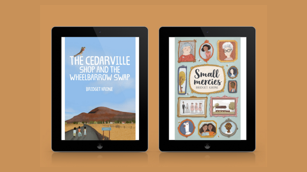 A book bundle featuring ePub versions both of Bridget Krone's award-winning middle-grade novels, Small Mercies and The Cedarville Shop and the Wheelbarrow Swap.